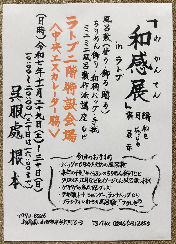 風呂敷(使う・飾る・贈る)、手拭、和柄バッグなどを展示販売いたします!