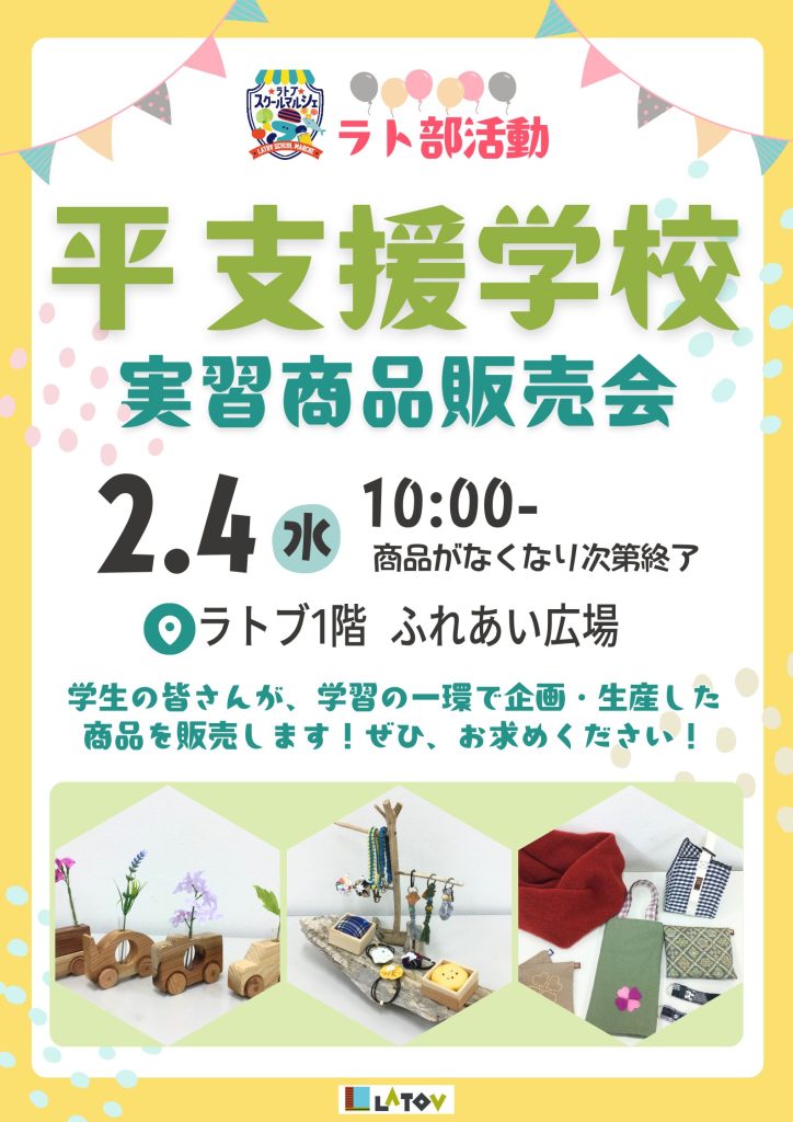 イベント Event EVENT 2026.01.04 latov シェア Tweet ラト部活動 平支援学校 実習商品販売会【2/4】 平 支援学校の生徒さんによる実習商品販売会を開催します😄 生徒の皆さんが学習の一環で生産した商品を販売いたします! 是非お求めください✨ PREV あぶくまロマンチック街道 沿線地域物産フェア【2/6-7】 NEXT にぎらないおにぎりカフェふくろうランチボックス販売会【2/4・2/18】