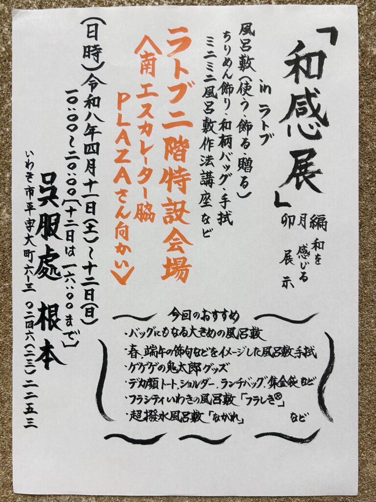 風呂敷(使う・飾る・贈る)、手拭、和柄バッグなどを展示販売いたします。