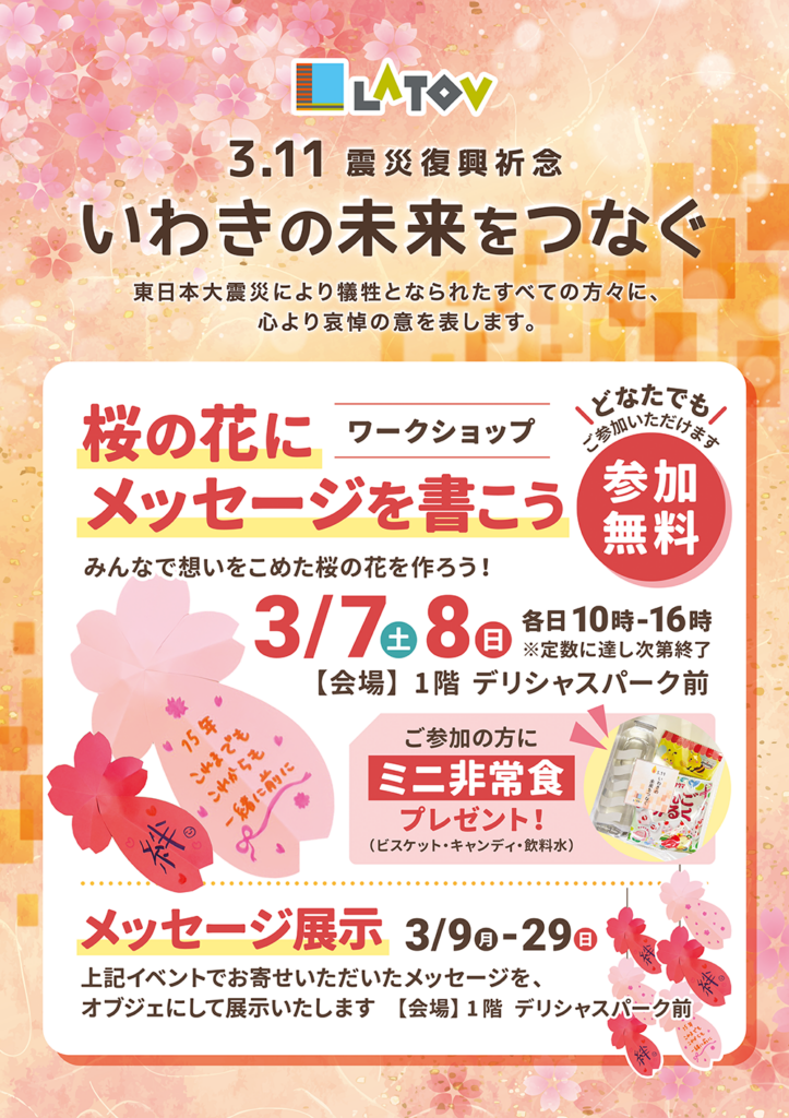 東日本大震災から15年を迎えるにあたり、ラトブでは桜の花びらにメッセージを添えるワークショップを開催いたします。