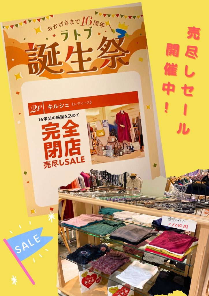 只今キルシェでは、16年間の感謝を込めて「完全閉店 売尽しSALE」を開催しております。