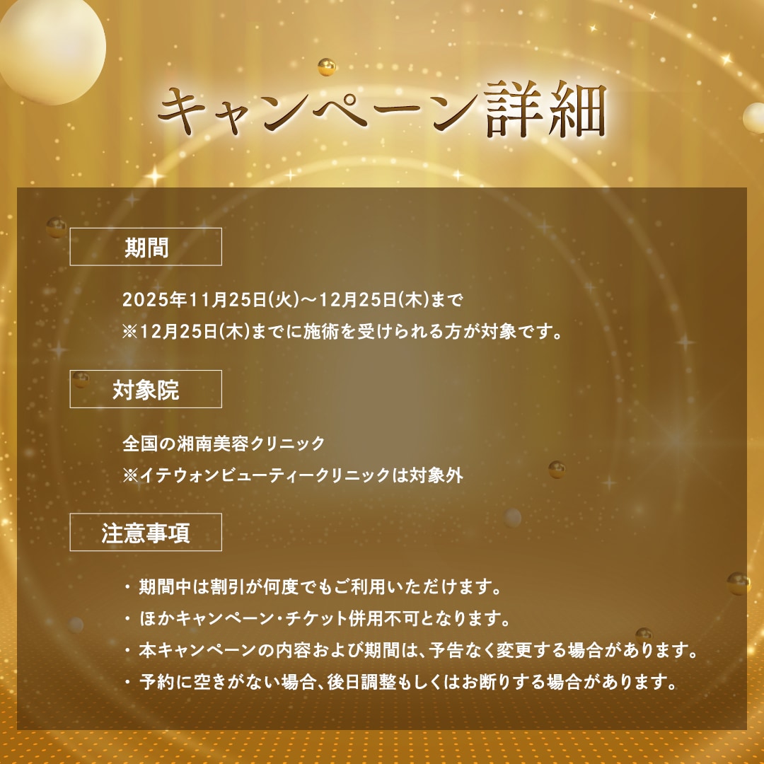 ショップニュース Shop News SHOP 2025.11.26 sbciwaki湘南美容クリニック シェア Tweet 【脂肪吸引15%OFF】今年中に余分な脂肪をお得に減らせるキャンペーンが開始🉐🎉 年末年始などのイベントにかけてダイエットに力を入れる方も多いのではないでしょうか? どれだけダイエットを頑張ってもなかなか落ちない「二の腕」や「フェイスライン」の脂肪。 12/25までお得に減らす事が可能です🥺🉐 年末年始までにダウンタイムを落ち着かせたい方や、 お休みの期間を利用して施術を受けたい方はお早めにご相談くださいませ🎄💖 \いわき院☎️0120-271-295/ 湘南美容クリニック いわき院 FLOOR 3F OPEN 10:00~19:00 (定休日:月・木) CATEGORY 美容・医療 sbciwaki湘南美容クリニック 関連記事 【脂肪吸引15%OFF】今年中に余分な脂肪をお得に減らせるキャンペーンが開始🉐🎉 年末年始などのイベントにかけてダイエットに力を入れる方も多いのではないでしょうか…… 2025.11.26 「ジャルプロスーパーハイドロ」「デンシティ」が大幅値下げ🉐✨ 導入されてからずっと人気が続いている ✨「ジャルプロスーパーハイドロ」「デンシ…… 2025.11.15 11月のキャンペーン🌝🍂たるみもシミもお得に改善するなら湘南美容クリニックいわき院へ! 11月も残り半月となりました!🍁 皆さん今月のキャンペーンのチェックはお済みで…… 2025.11.15 🎃10月キャンペーン🎃今月もお得情報盛り沢山! 10月もお得なキャンペーンがスタートしました!📣 今月は、大人気治療「女優注射…… 2025.10.5 【💎MTプレミアムコフレ2025💎】先行予約開始! 毎年大人気過ぎてすぐに完売してしまう 【🫧MTプレミアムコフレ2025🫧】 …… 2025.10.5 新治療ジャルプロもキャンペーンに追加! 《こんなお悩みありませんか?👀》 たるみは気になるけれ…… 2025.9.24 外科治療で使える2万円OFFチケット配布中🎟️🎉 現在湘南美容クリニック公式LINEから【通常価格10万円以上】の外科治療…… 2025.9.24 【新治療】最新リフトアップ治療デンシティ導入! 遂にいわき院にも最新リフトアップ治療がやってきました!! その名も... …… 2025.9.24 【たるみ改善】効果実感UP!お悩みの部位に合わせたメニューも豊富に! 《施術価格:2025年6月時点》 「最近たるみが気になる」 「以前よ…… 2025.6.15 《新治療追加》たるみ予防まで叶える最新脂肪溶解注射💉🔥 遂に!いわき院にも施術可能に✨ 脂肪溶解成分が従来の一万倍!! 更に、脂…… 2025.6.15 PREV アカベコランド 酪王ぷかぷかあかべこシリーズ