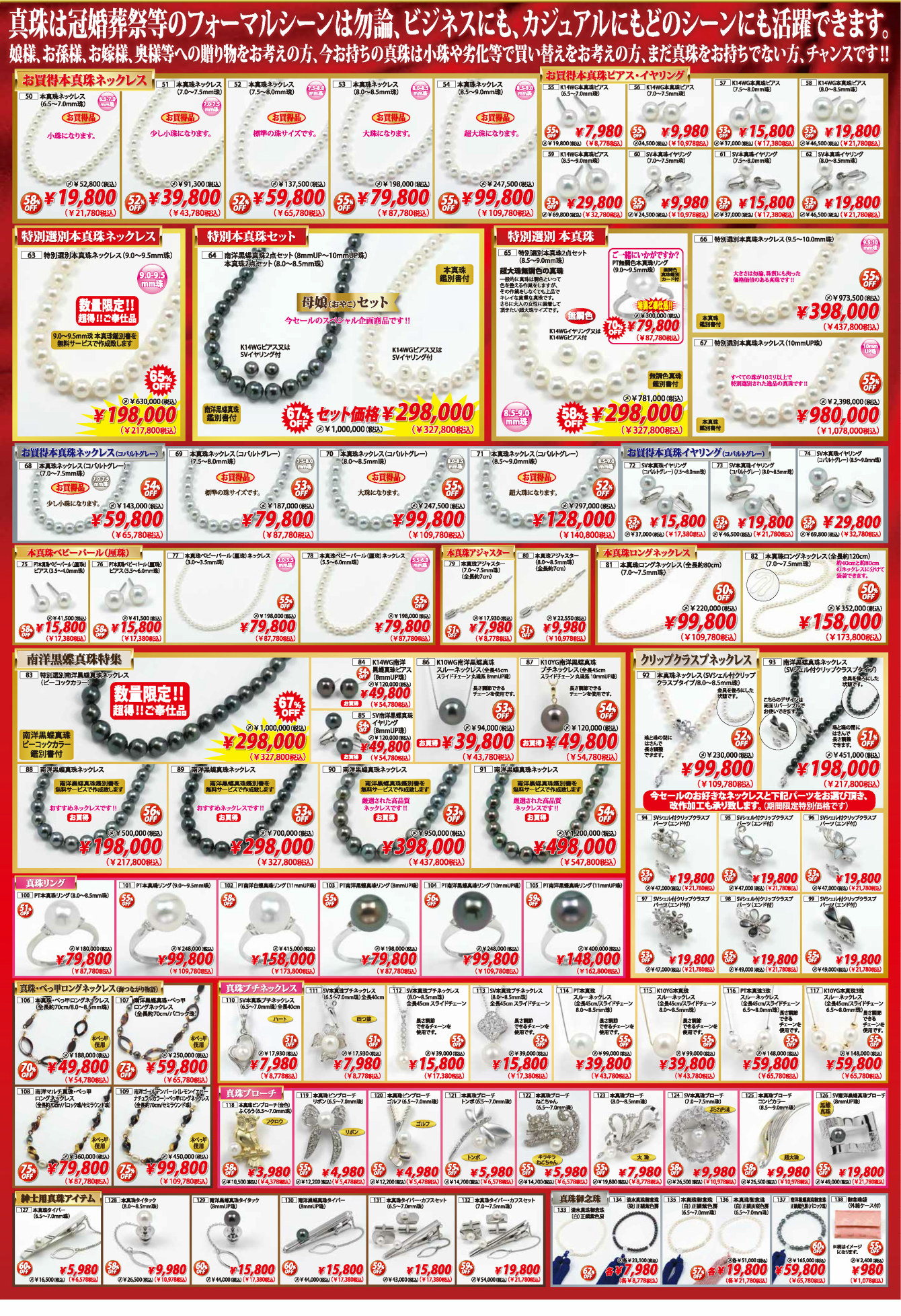 真珠メーカー協賛の真珠大還元市として、アコヤ本真珠ネックレスやブラックパールネックレスなど数多く取り揃えております。